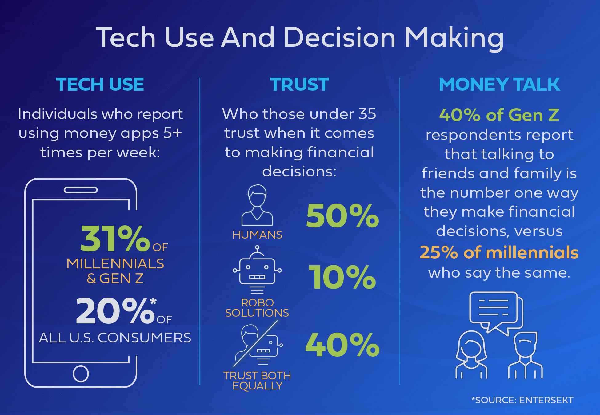 It’s true that both of these cohorts are comfortable using tech when it comes to their finances. Nearly one-third of Millennials and Gen Z (31%) report using banking, budgeting or investment apps daily five or more times per week. That’s compared with a recent survey that found 20% of all U.S. consumers use banking apps daily.